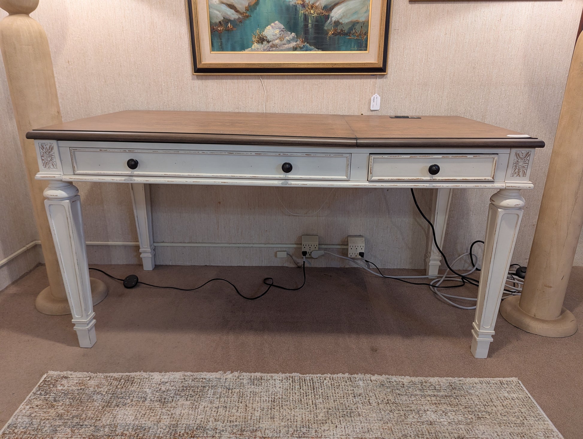 Elegant distressed desk. Lifttop to allow you to stand while working at your desk while also providing storage.